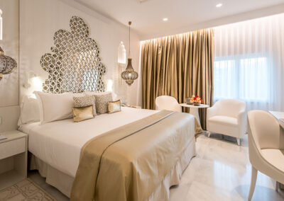 La diversidad de habitaciones y suites merece un capítulo aparte; desde las estancias de estilo mudéjar -todas diferentes entre sí-, con arcos, celosías y preciosas lámparas arabescas, a las mediterráneas, en tonos claros y con decoración de inspiración marinera, pasando por las botánicas con jardín privado y las clásicas, que recogen la elegancia de los espacios más nobles del hotel a través de molduras, cornisas, frisos y medallones. Además, cuenta con exclusivas suites, entre ellas ‘la del arquitecto’, o ‘la suite de los toreros’.