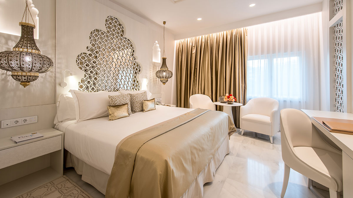 La diversidad de habitaciones y suites merece un capítulo aparte; desde las estancias de estilo mudéjar -todas diferentes entre sí-, con arcos, celosías y preciosas lámparas arabescas, a las mediterráneas, en tonos claros y con decoración de inspiración marinera, pasando por las botánicas con jardín privado y las clásicas, que recogen la elegancia de los espacios más nobles del hotel a través de molduras, cornisas, frisos y medallones. Además, cuenta con exclusivas suites, entre ellas ‘la del arquitecto’, o ‘la suite de los toreros’.